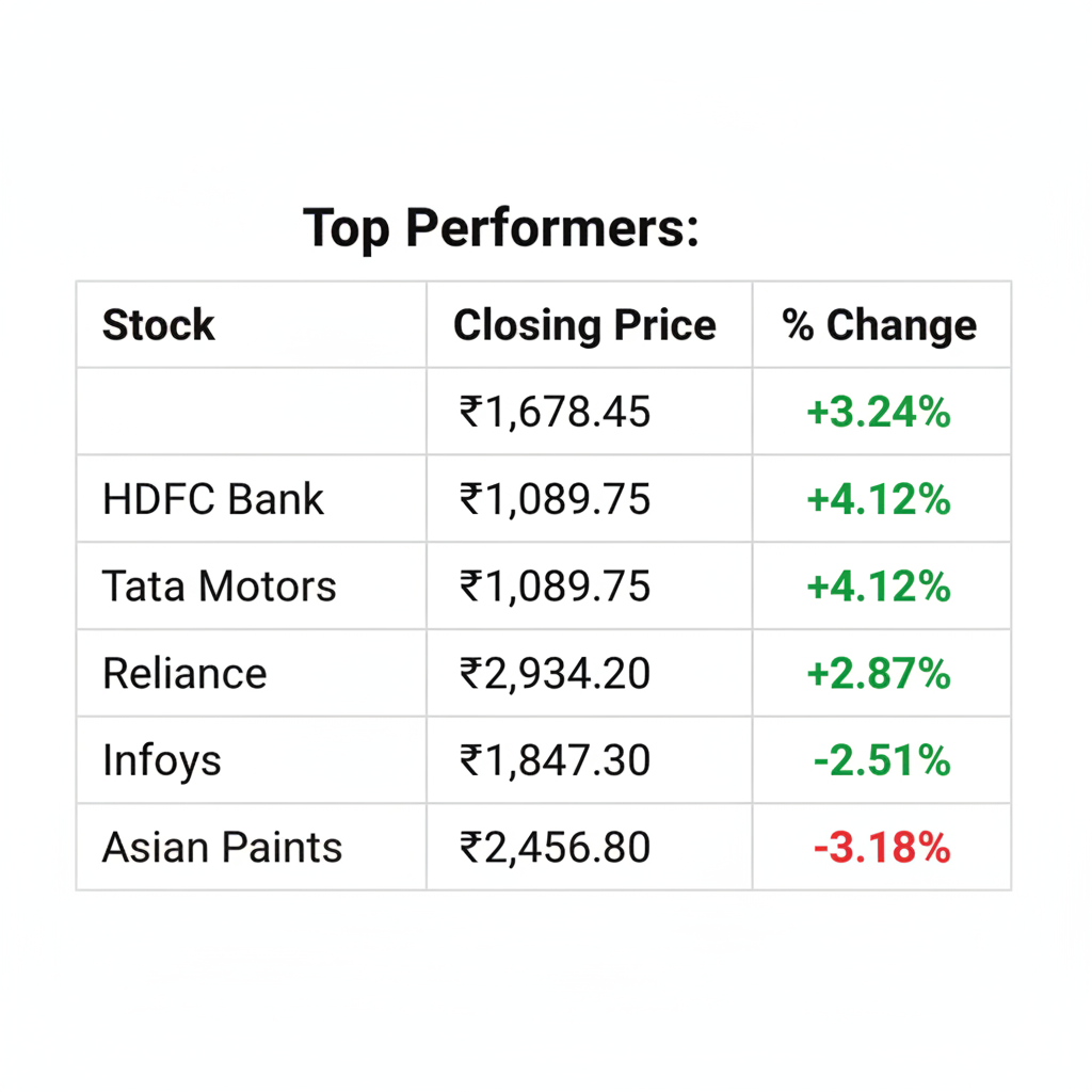 HDFC Bank emerged as the biggest gainer among Sensex components, surging 3.24% to ₹1,678.45 on expectations of strong net interest income (NII) growth in Q2FY26 results. Reliance Industries gained 2.87% to ₹2,934.20 following news of a strategic partnership between Jio Platforms and a global technology major. Infosys climbed 2.51% to ₹1,847.30 as the dollar’s strength against emerging market currencies boosted prospects for IT exporters. Tata Motors rallied 4.12% to ₹1,089.75 on robust September auto sales data and strong export order bookings for its commercial vehicle segment.
